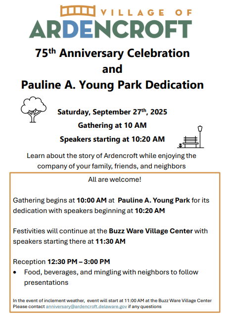 Mark your calendars for our 75th Anniversary of when Ardencroft became a municipality. In addition to celebrating this significant anniversary, we will formally dedicate the Pauline A. Young Park on Sunset Lane.